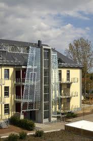 Der Entwurf sieht die Öffnung der Treppenhäuser und vorgstellte Balkone vor, um die Monotonie der Fassade aufzubrechen. Der Karsernencharakter kann so aufgelöst werden. Es entsteht eine mit interresanten Blickachsen und Außenräumen emontional ansprechende Wohnbebauung.
